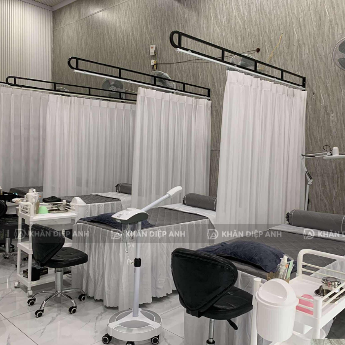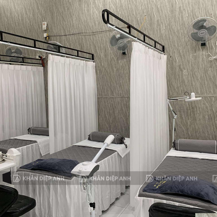 KHĂN, GA GIƯỜNG SPA màu trắng xám phối kết hợp tạp điểm nhấn làm cho Spa của bạn thật nổi bật.